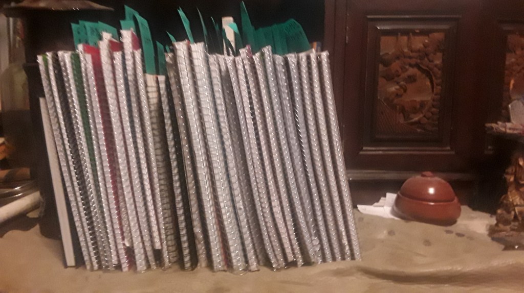 The thirty encyclopedias made me think of my stack of notebooks I journal in.
