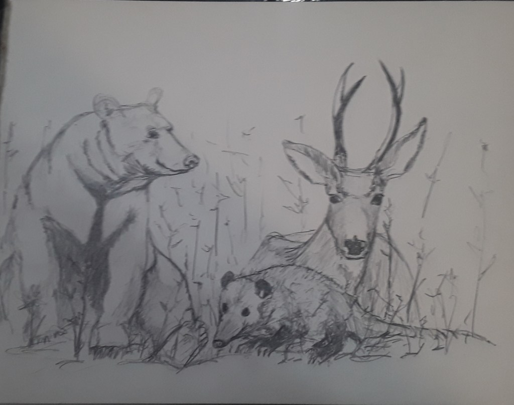 Startled to see Four Crows, the deer eyes darted from him to the bear. Four Crows heard the deer speak to bear, “There’s Four Crows, didn’t expect to see him here. I’m surprised to see a human.”